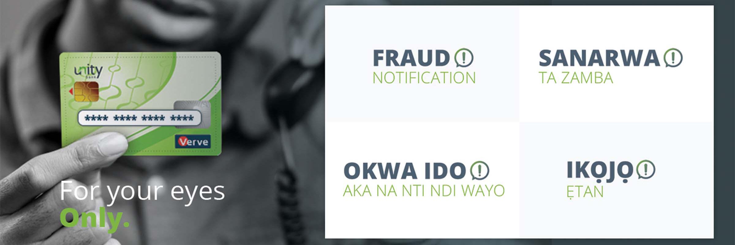 Jọwọ se akiyesi pe awọn alaye Account rẹ wa fun oju rẹ nikan, ma seje ki elomiran ri. Mase safihan nọmba Accounti rẹ, awọn ọrọ igbaniwọle, OTP, PIN, BVN ati awọn alaye kaadi si ẹgbẹ kẹta tabi enikeni, tabi se isanwo si ẹnikẹni fun ‘isopọ BVN’, nitori wipe Unity Bank tabi osisẹ rẹ kii yoo beere awọn alaye wọnyi lati ọdọ rẹ.